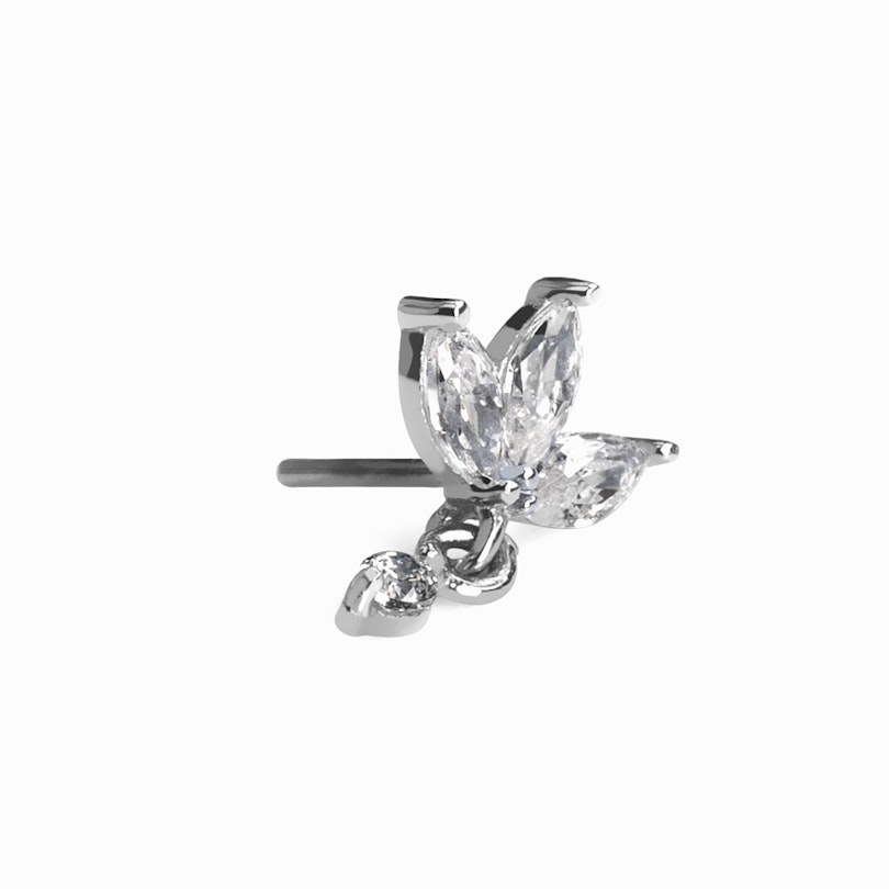 Dieses atemberaubende Labret besticht durch drei Zirkonia-Steine im Marquise-Schliff, die in Form einer Lotusblume angeordnet sind. Ein weiterer runder Zirkonia-Stein hängt in einem Anhänger in der Mitte der Blume herab.