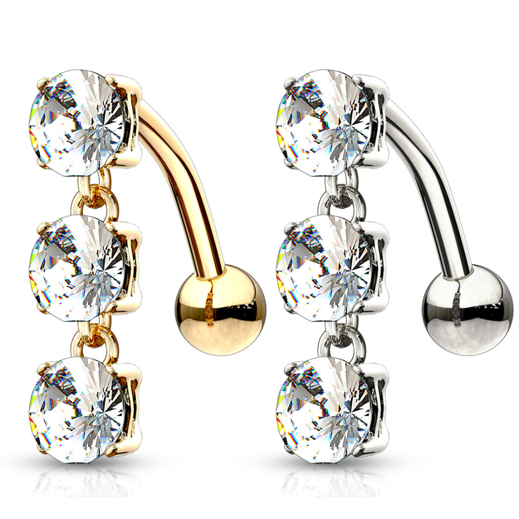 Bauchnabelpiercing aus 14 Karat Gold mit umkehrten Anhänger und drei Steinen