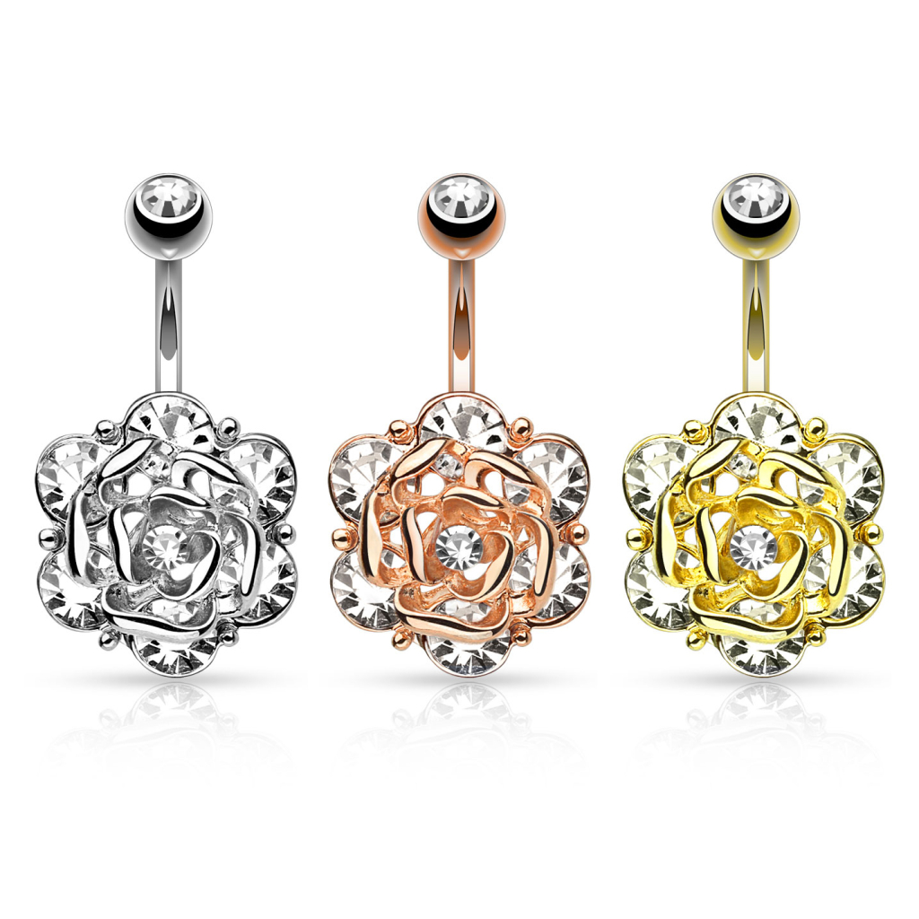 Bauchnabelpiercing in verschiedenen Farben mit einer Blume aus Steinen