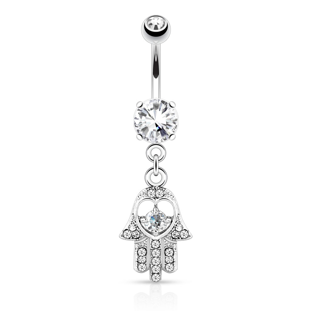 Hier kannst du dir einen richtig schönes Bauchnabelpiercing mit einer Hamsahand im Anhänger aneignen. Die Hamsahand ist ein uraltes Symbol aus dem mittleren Osten, was als schützendes Amulet für den jeweiligen Träger galt. Aus diesem Grund wurde die Hamsahand auch ein sehr beliebtes Schmucksymbol.