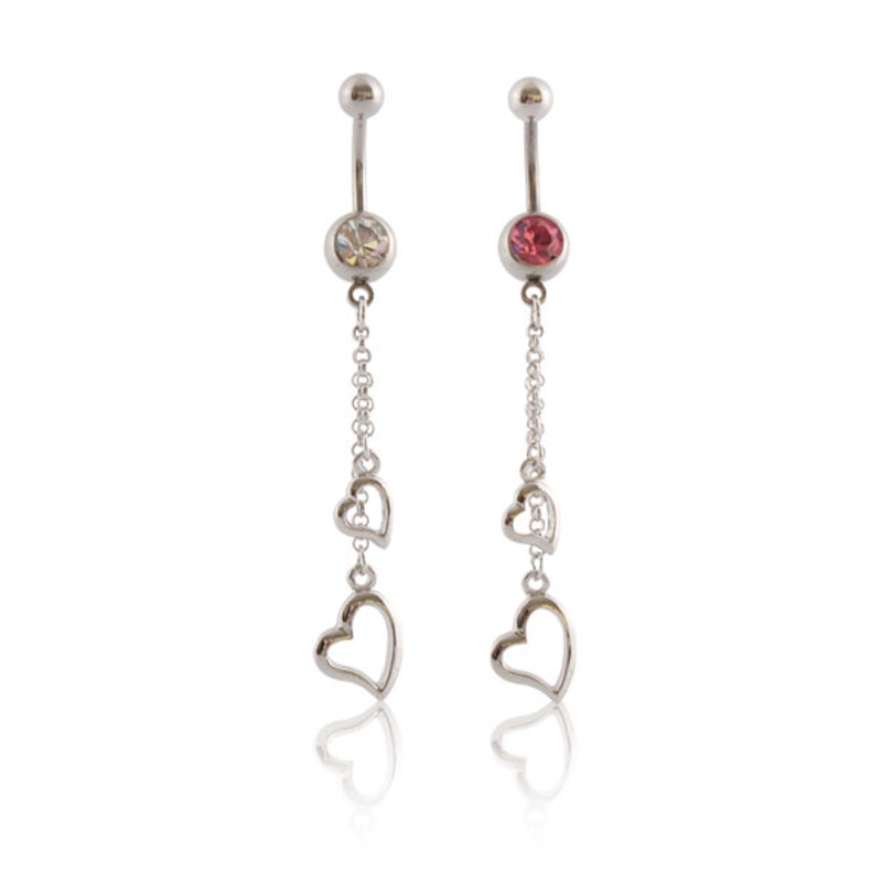 Der Piercingschmuck hat zwei Herzen in verschiedenen Größen in der herunterhängenden Kette befestigt. Die Ketten hängen von der schönen Bundkugel mit dem großen Stein herunter.