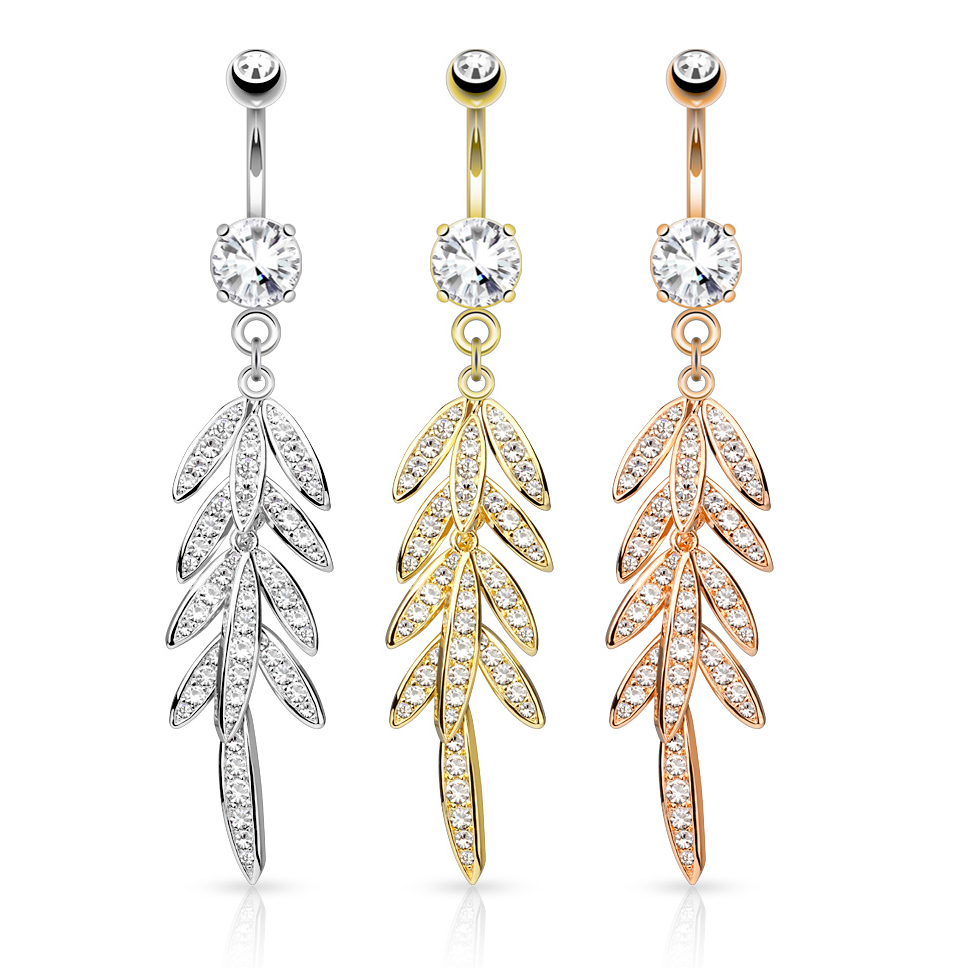 Schönes und elegantes Schmuckstück für den Bauchnabel, dessen Anhänger ein Reihe von kleinen Blättern sitzt. Jedes Blätterpaar ist frei beweglich, da sie paarweise angebracht wurden. Alle Blätter wurden mit schönen glitzerenden Steinchen verziert, so daß die über 50 Steine ein tolles Glimmerspiel abgeben, wenn man den Schmuck trägt und der Anhänger sich von links nach rechts hin und her bewegt.