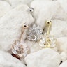 Hier bist du auf ein animalisches Bauchnabelpiercing mit einem Pfau gestoßen. Männliche Pfaue schüchtern sich gegenseitig mit ihren langen und fächerartigen Schwanzfedern ein, bei diesem Schmuck werden diese Federn durch marquise geschliffene Steine visualisiert. In der Regel besitzt ein Männchen zwischen 100 und 150 Schwanzfedern, dies als Schmuck zu realisieren wäre wohl etwas zu utopisch gewesen, somit kommt dieser Schmuck mit sieben Schwanzfedern in der Form von Steinen.