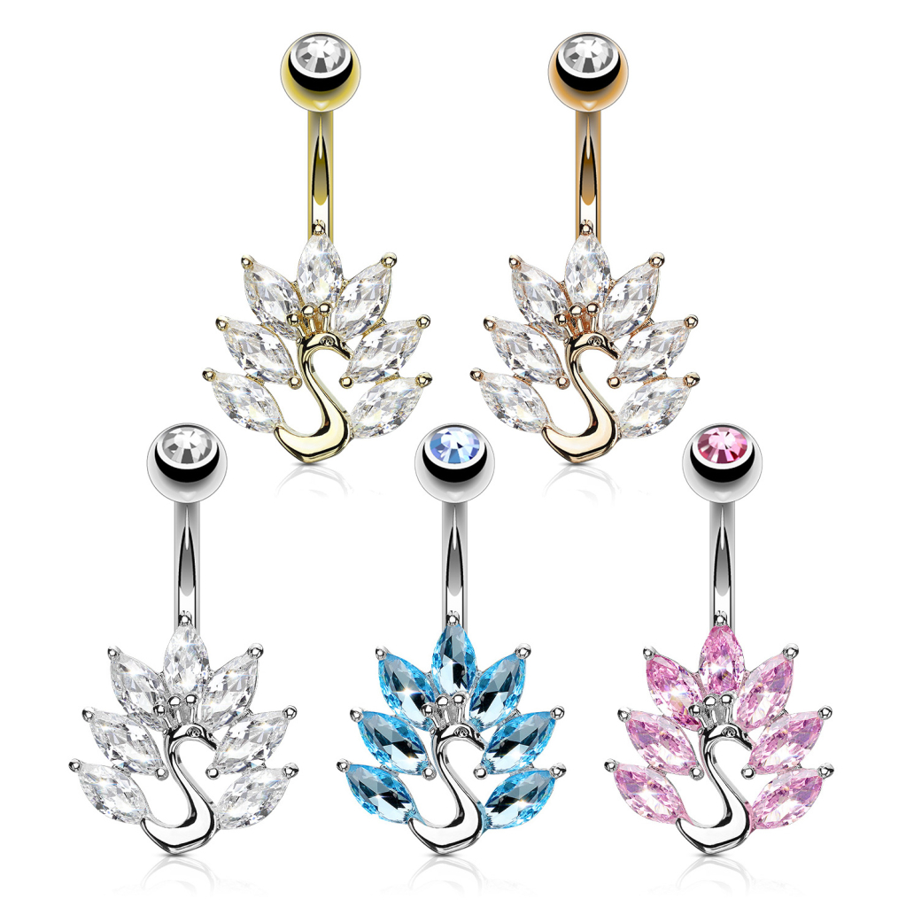 Hier bist du auf ein animalisches Bauchnabelpiercing mit einem Pfau gestoßen. Männliche Pfaue schüchtern sich gegenseitig mit ihren langen und fächerartigen Schwanzfedern ein, bei diesem Schmuck werden diese Federn durch marquise geschliffene Steine visualisiert. In der Regel besitzt ein Männchen zwischen 100 und 150 Schwanzfedern, dies als Schmuck zu realisieren wäre wohl etwas zu utopisch gewesen, somit kommt dieser Schmuck mit sieben Schwanzfedern in der Form von Steinen.