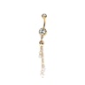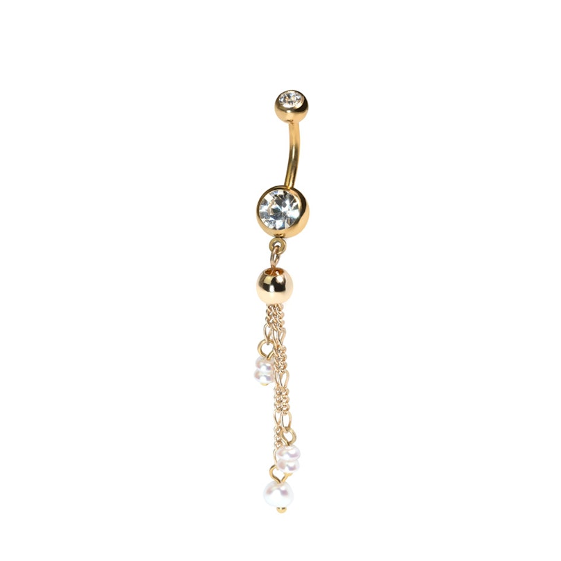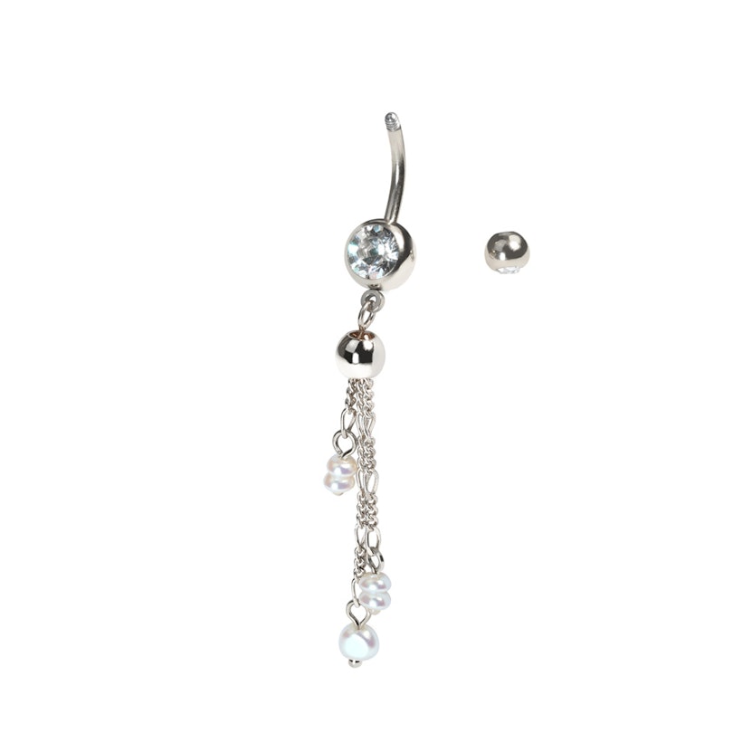 Dieser Bauchnabelstab mit Ketten und Perlen hat in beiden Kugeln eingefasste Zirkoniasteine, und an der unteren Kugel baumeln zarte Ketten mit unterschiedlich großen Kunstperlen.