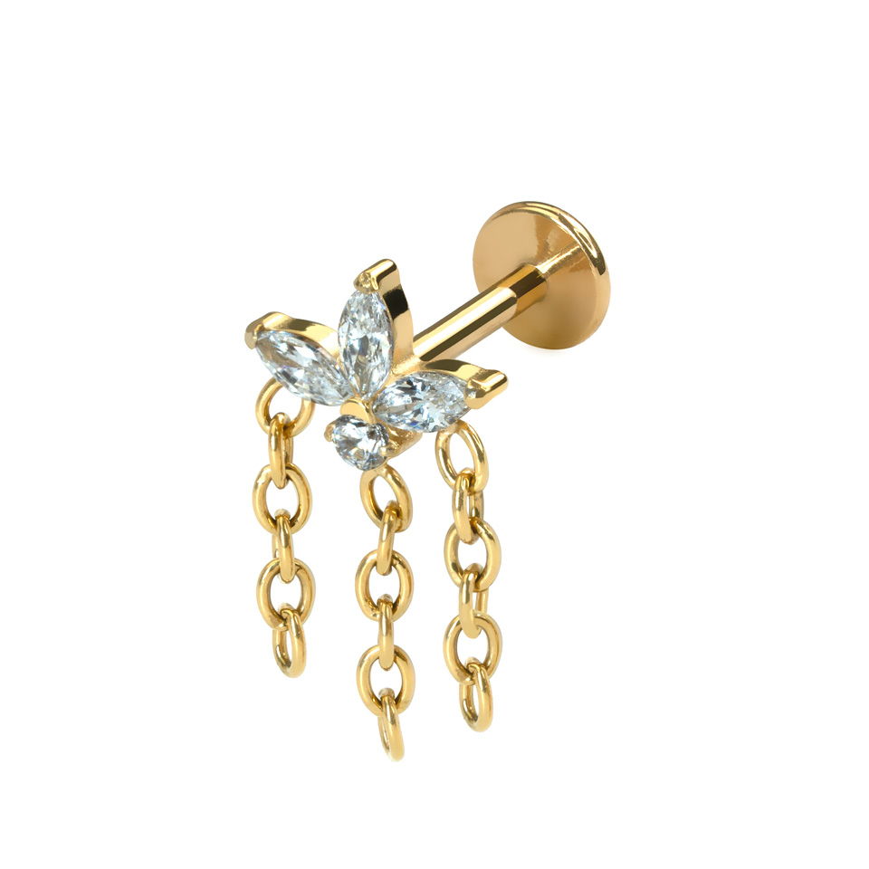 Dieses ausgefallene Labret besteht aus 4 CZ-Steinen; drei davon sind im Marquise-Schliff und liegen gleichmäßig um einen kleineren runden Stein herum, was dem Schmuckstück die Form einer Blume verleiht. Jeder der unteren drei Steine ist mit einer filigranen Kette versehen, an der er hängt. Dieses Schmuckstück lässt sich eindrücken, d. h., man muss nur den Stift einführen und dann den oberen Teil eindrücken, um es in das Piercing einzusetzen. Der aus Titan gefertigte Schmuck ist auch für empfindliche Haut geeignet. Dank seiner zierlichen Größe ist er ideal für verschiedene Ohrpiercings, darunter flache, Tragus- und übereinanderliegende Ohrläppchenpiercings.