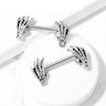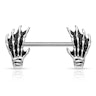 Wenn du dieses Piercing in deinem Brustwarzenpiercing trägst, sitzt eine Skeletthand an den beiden Seite deiner Brustwarze. Die Hände sitzen am Ende eines 1,6 mm dicken Stabs. Zwischen den Händen findet deine Brustwarze 12 mm Platz. Einer der Hände kann abgeschraubt werden, ansonsten wäre es wohl auch ziemlich schwierig gewesen, den Schmuck einzusetzen. Beide Hände bestehen aus Messing, dieses wurde rhodiniert, um der glänzenden Erscheinung des Stabs zu entsprechen. Zwischen den Knochenhänden befindet sich eine schwarze Farbe, welche den Schmuck oxidiert und etwas antik wirken lässt. Gleichzeitig verleiht es dem Schmuck mehr Tiefe und Details.