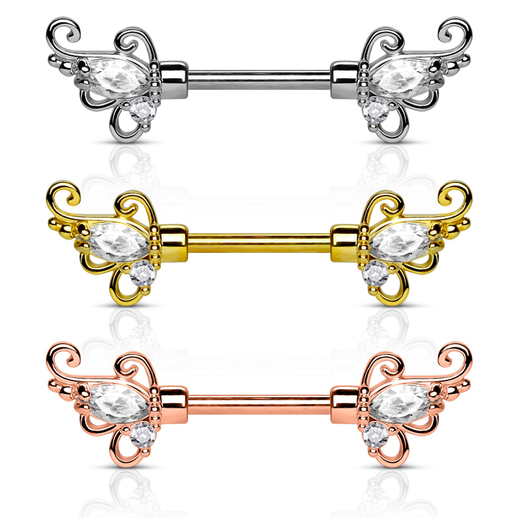 Brustwarzenpiercing mit Verschnörkelungen und Steinen