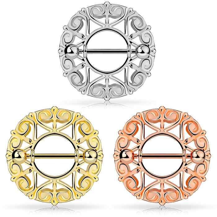 Das ist wie eine Köngiskrone auf den Brustwarzen, wenn mein sein Nippelpiercing mit diesen traumhaft schönen Brustschild verziert. Dieser Schmuck ist schön und symmetrisch, mit einem eleganten Design, das viele tolle Motive kreuz und quer in sich vereint.