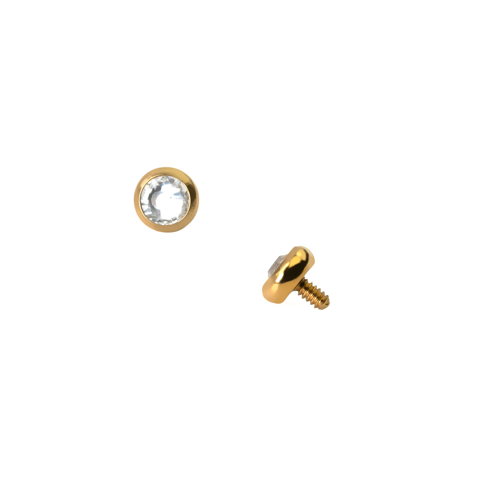Dieses Schmuckstück für ein Dermal Anchor besteht aus einer kleinen runden Platte, in der ein schöner klarer Stein sitzt.