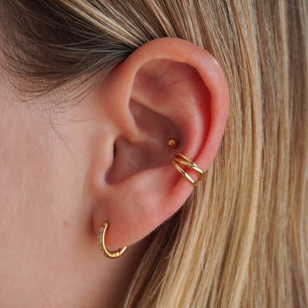 Klare Linien mit etwas Struktur. Der dreifach gekreuzte Ear Cuff vereint drei geschmeidige Ringe und rundet deinen Look auf eine mutige, aber ausbalancierte Weise ab.