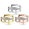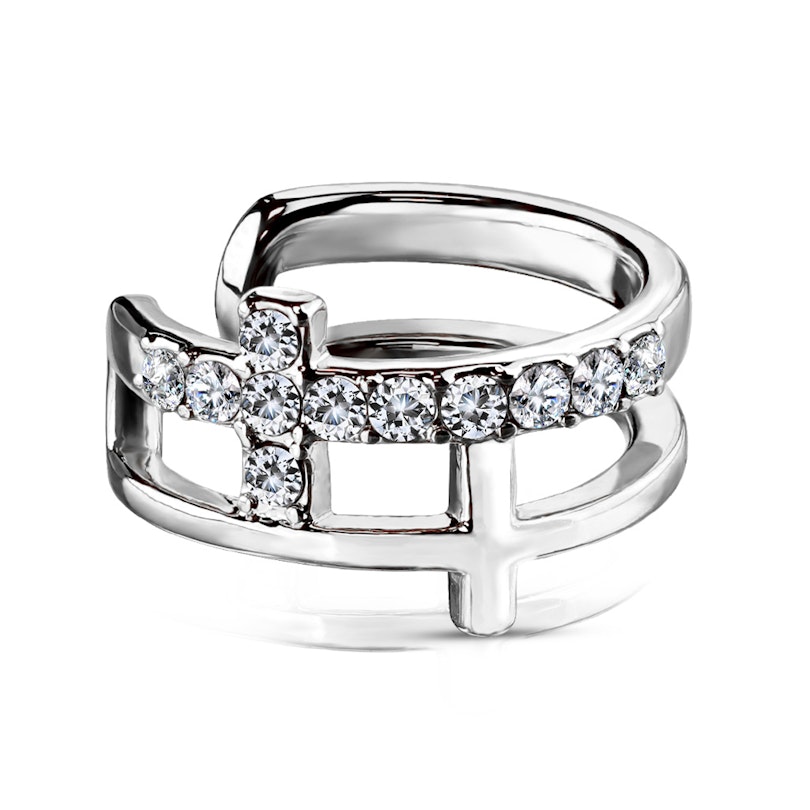Auf dem Schmuck befinden sich zwei Kreuze. Ein Kreuz wurde mit kleinen und klaren Steinen verziert, das andere Kreuz kommt ohne Steine. Die Steine des einen Kreuzes verleihen dem Earcuff noch mehr Eleganz, denn sie reflektieren das Licht, welches auf sie fällt - hier strahlt die Schönheit des Schmucks durch.