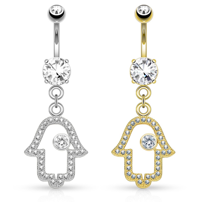 Name: Edles Bauchnabelpiercing aus 14 Karat Gold mit steinverzierter Hamsahand