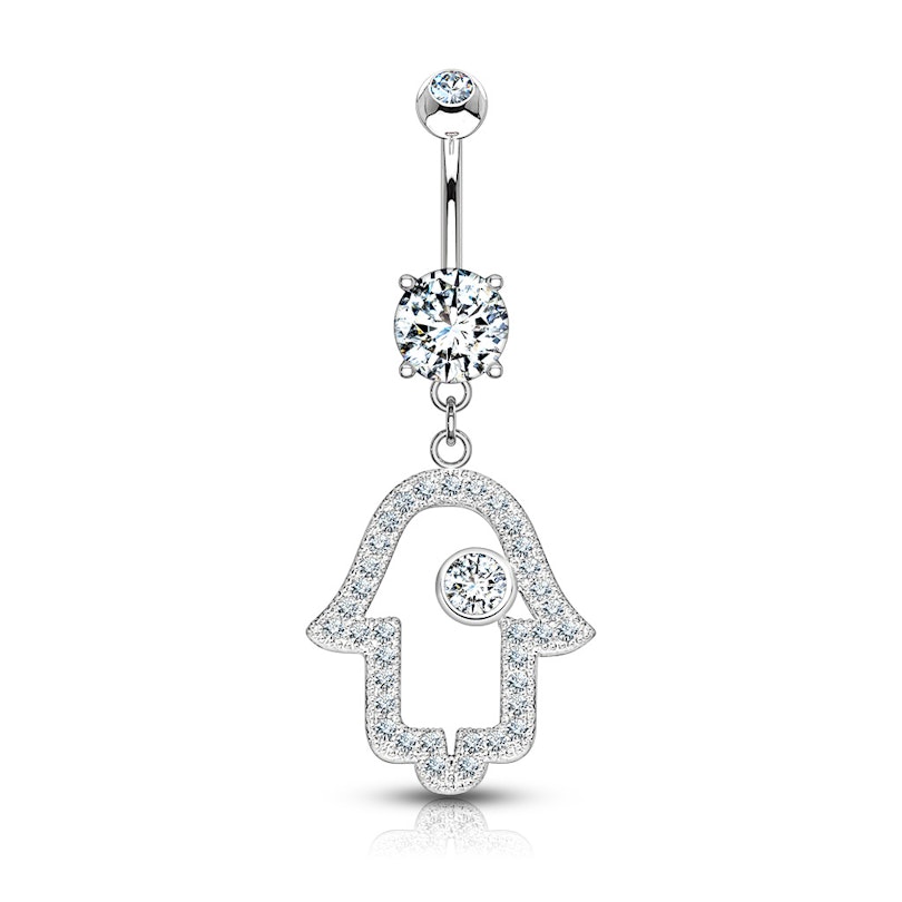 Die Hamsahand hängt als frei beweglicher Anhänger vom eigentlichen Piercing herunter und kann so deinen natürlichen Körperbewegungen ganz harmonischc folgen. Es wurde mit kleinen, schönen Steinchen verziert, die dem Schmuck eine gewisse Finesse verleihen, besonders der große Stein, der ganz geschickt in der Hand seitlich platziert wurde. Auch die beiden Kugeln des Piercings sind natürlich mit einem klassischen, klaren Stein verziert.