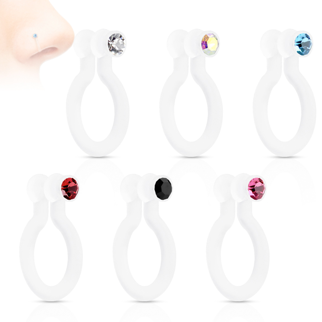 Hier bekommst du ein wirklich schönes Fake Nasenpiercing mit einem einfachen, diskreten Stein ohne dafür wirklich ein Piercingloch in der Nase haben zu müssen. Dieses schöne Schmuckstück sieht aus wie ein kleiner klarer Ring aus PTFE mit einem Stein, der in die Nase geht. In Wirklichkeit jedoch, ist dieser Ring nur ein kleiner Bügel, der um den Nasenflügel geklemmt wird und sich von jeder Seite an die Nasenwand pressen wird.