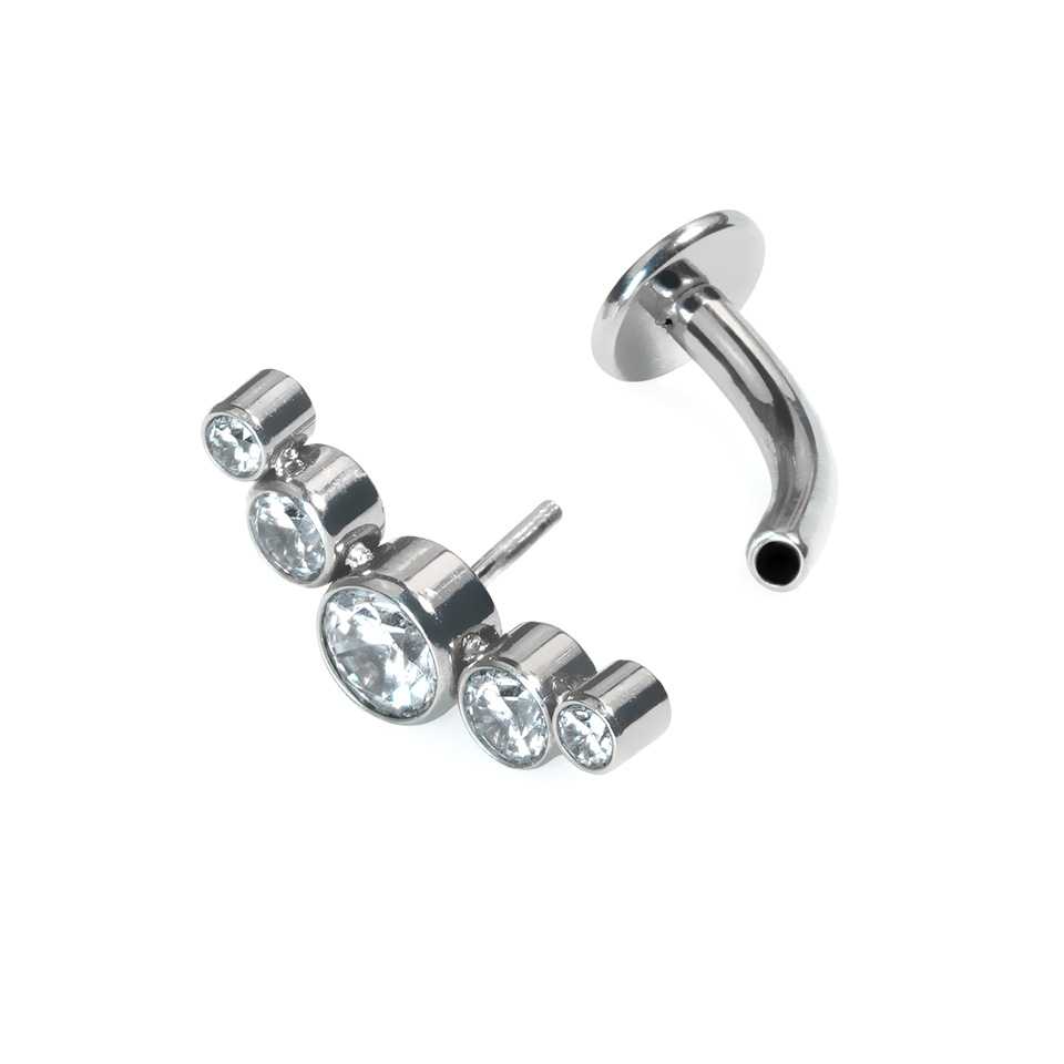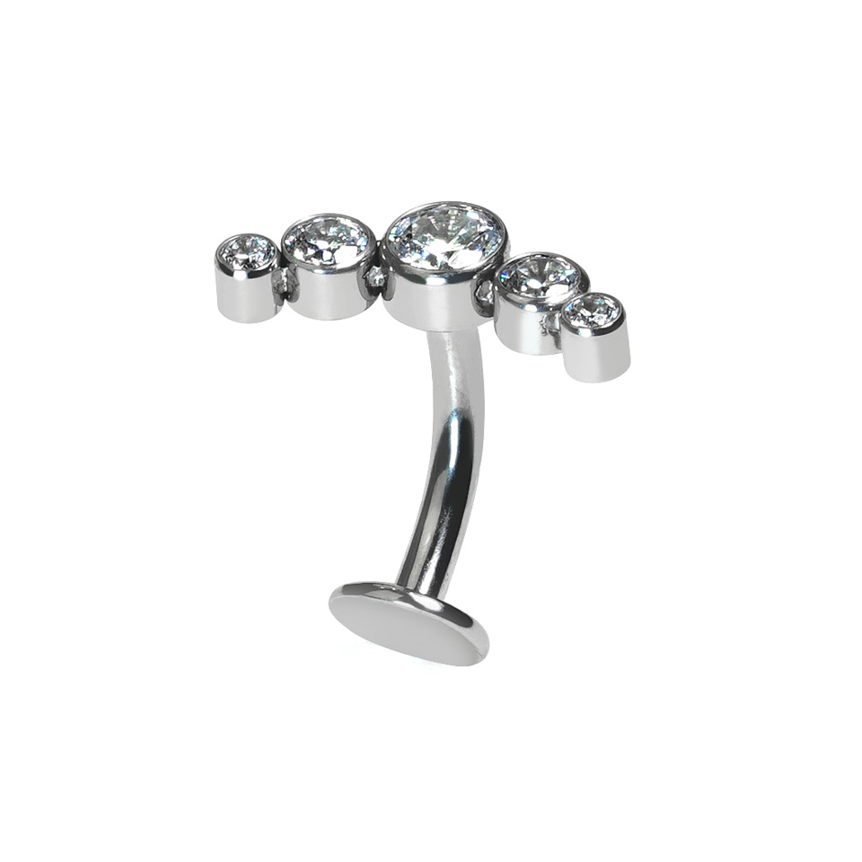 Dieser schwebende („floating“) Bauchnabelring aus Titan ist mit fünf Schmucksteinen besetzt. Da er aus Titan gefertigt ist, ist er hypoallergen und wasserfest. Er wird mit einem Push-in-Mechanismus geschlossen, d. h., um ihn in deinem Piercing zu befestigen, musst du nur den Stift leicht biegen und ihn in den Schaft einführen.