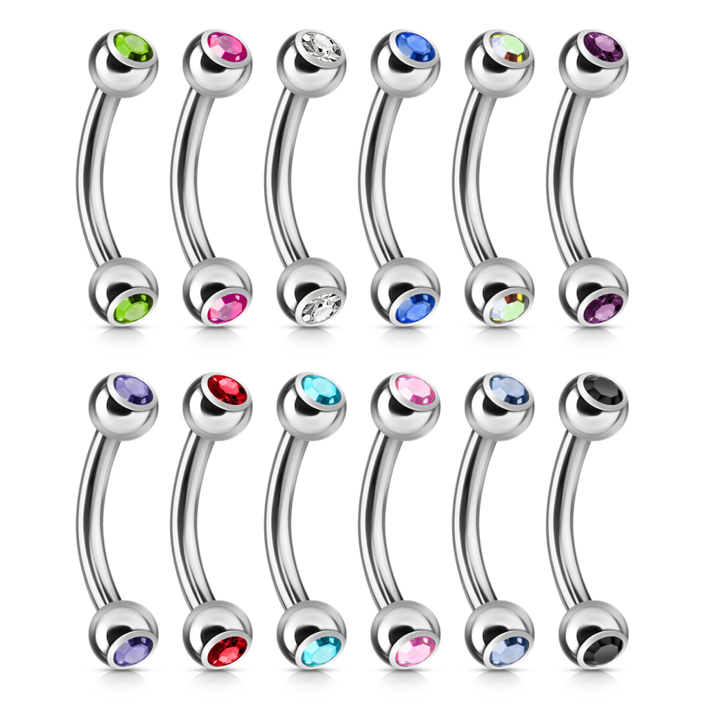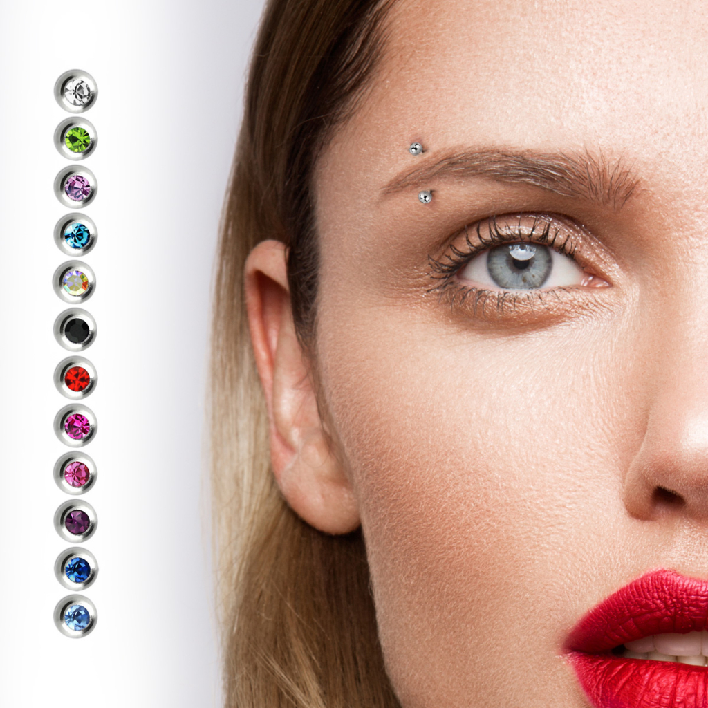 Die zwei Kugeln an den Enden haben jeweils einen Durchmesser von 3 mm und somit eine schöne Größe, wenn du es z.B. als Augenbrauenpiercing verwendest. Die Kugeln wurden mit einem schönen Stein versehen, der in verschiedenen Farben erhältlich ist.