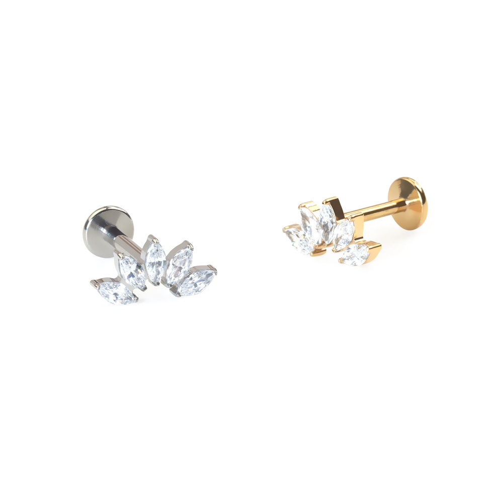 Dieses Titan-Labret ist mit 5 marquisegeschliffenen CZ-Steinen versehen, die bogenförmig angeordnet sind. Der Schmuck ist mit einem Innengewinde versehen, d.h. um ihn zu tragen, führe einfach den glatten Schaft durch Dein Piercing und schraube die Spitze fest. Er ist aus Titan gefertigt, so dass er auch für Menschen mit empfindlicher Haut angenehm zu tragen ist. Er eignet sich für viele Ohrpiercings, sieht aber besonders gut in Helix- oder Flachpiercings aus.