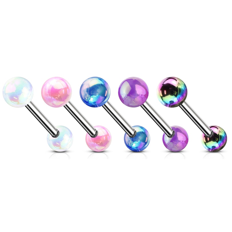 Das gesamte Schmuckstück ist aus Chirurgenstahl gefertigt; allerdings ist der Stab nicht beschichtet worden. Es kommt in seiner ursprünglichen hellen silbernen Farbe, die die beste Kombination mit jeder Kugel Farboption zur Verfügung schafft.