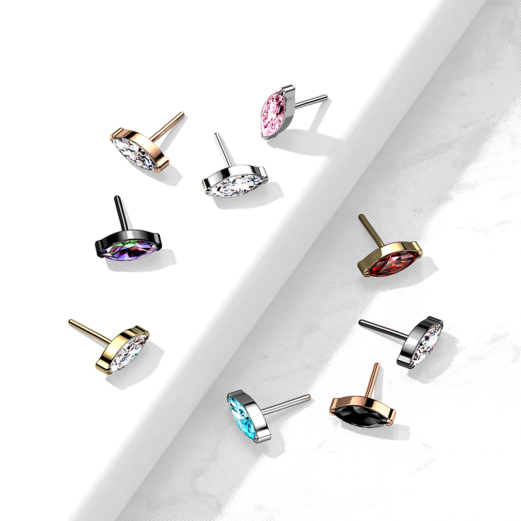 Gewindeloser Schmuck ist die beste Lösung für einen einfachen Schmuckwechsel. Bei uns findest du diesen atemberaubenden Afsatz mit einem marquiseförmige Stein für deine Push-in Schmuckstücke. Und wenn du dich für ein bestimmtes Style entscheidest, stehen dir alle Design Möglichkeiten offen, die dir einfallen! Du kannst einen einfachen, klaren Stein mit goldenem, rotgoldenem oder silberfarbenem Material für deinen alltäglichen Style wählen und dich für ein gewagteres Design, wie Rotgold mit schwarzem Stein, zum Ausgehen entscheiden.