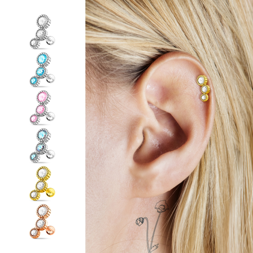 Helixpiercing mit 3 runden Steinen in verschiedenen Größen