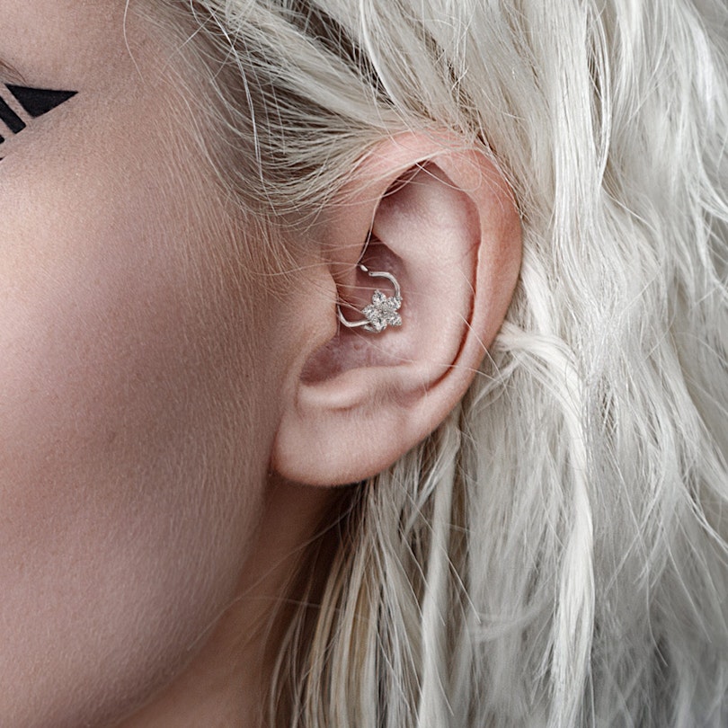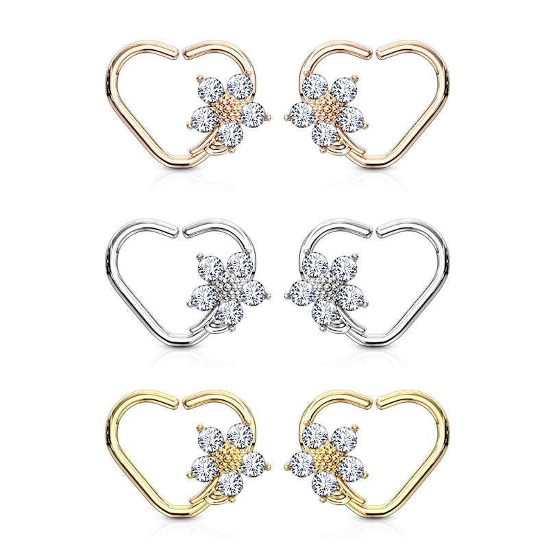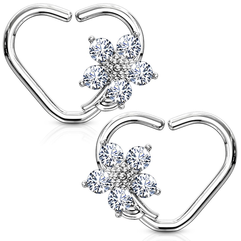 Herzförmiges Ohrpiercing mit Blume aus Steinen