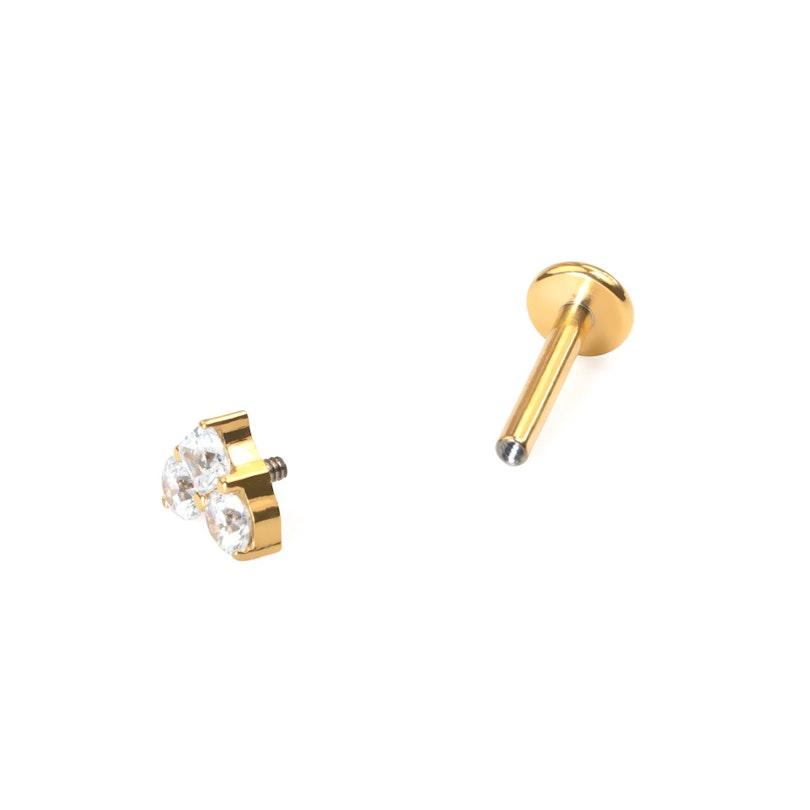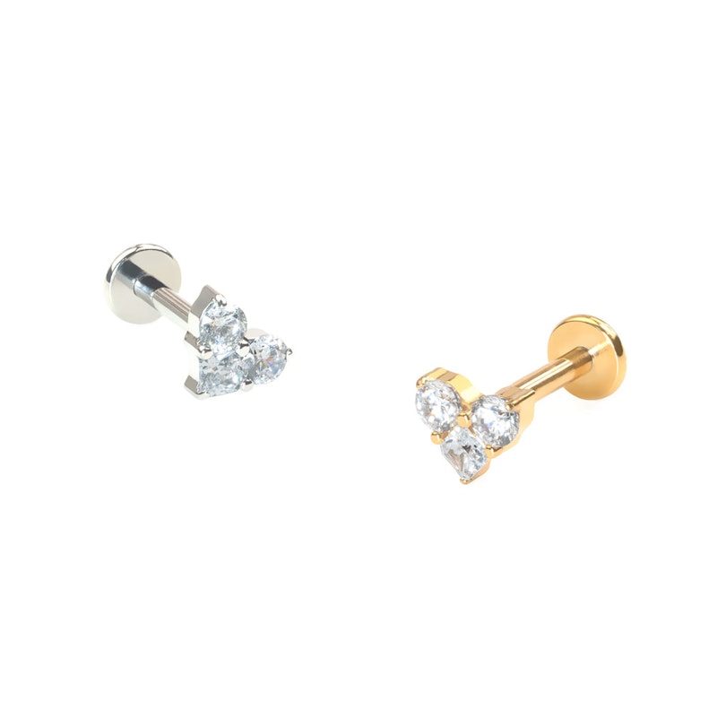 Dieses Titan-Labret ist mit 3 CZ-Steinen besetzt, die in einer Herzform angeordnet sind. Die beiden oberen Steine sind rund und der untere ist quadratisch. Es hat ein Innengewinde und ist wahlweise in Gold oder Silber erhältlich. Dieses niedliche Schmuckstück passt zu verschiedenen Ohrpiercings. An seiner breitesten Stelle misst er nur 5 mm. Die flache Rückseite sorgt für angenehmen Tragekomfort.