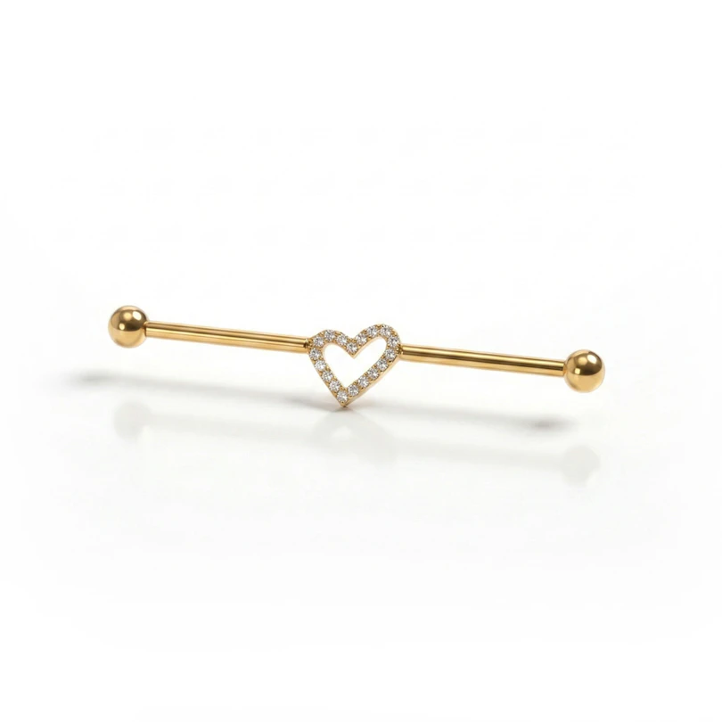 Dieser Industrialstab aus Titan mit Herz in der Mitte ergänzt die klassische Form eines Industrialstabs um ein verspieltes Detail. Ein Herz sitzt mittig, umrandet von kleinen Schmucksteinen in Krappenfassung und verleiht dem Schmuck feine Details, ohne dabei übertreiben zu wirken. Erhältlich in den Farben Gold und Silber, lenkt er den Fokus auf die Mitte und sorgt gleichzeitig für einen klaren, ausgewogenen Look des Stabs.