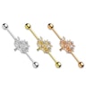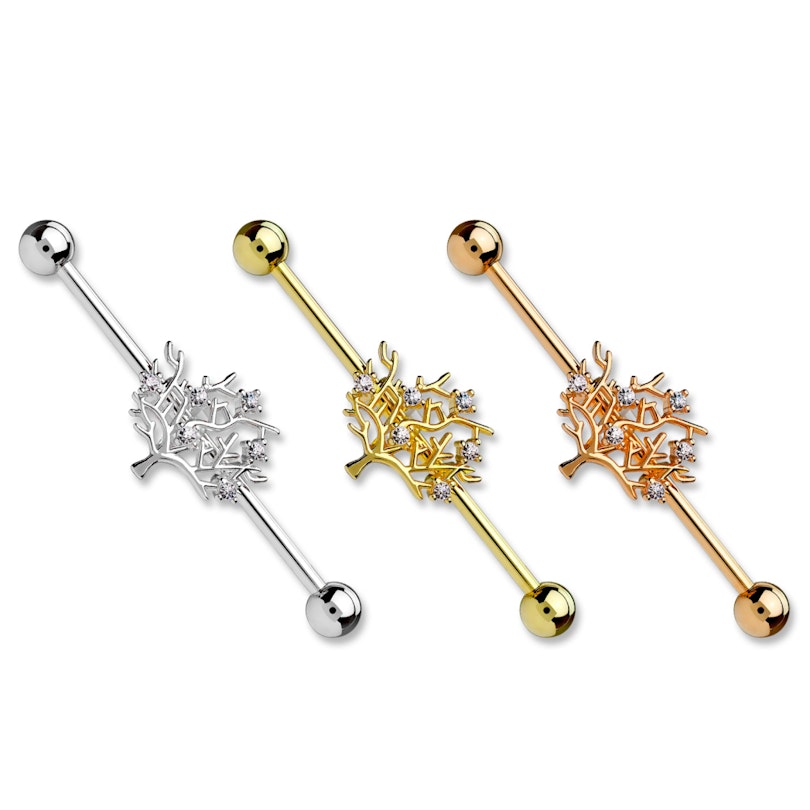 Der Stab besteht aus Chirurgenstahl und ist in drei verschiedenen Farben erhältlich. Die Farbe ist auch der einzige Unterschied zwischen diesen drei schönen Modellen, denn die Form und die Steinchen sind bei allen gleich. Der Baum selbst, besteht aus Messing und hat anschließend eine Farbbeschichtung erhalten, die dem Stab angepasst ist.