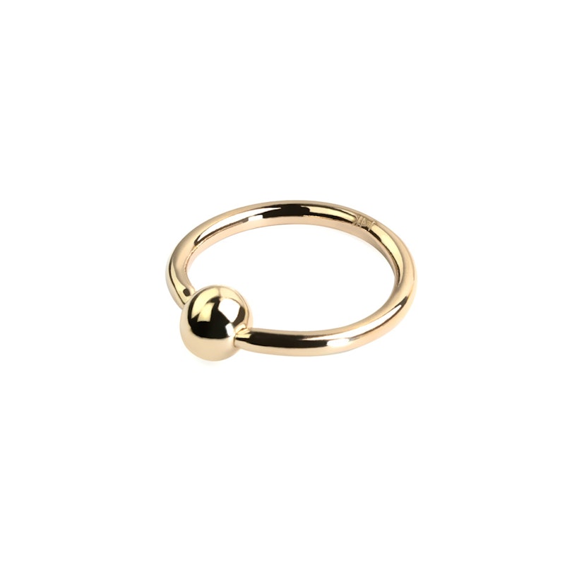 Schöner und schlicht gearbeiteter Kugelring im klassischen Design aus 14kt. Gold, anstelle von den typischen Materialien, die gerne für Kugelringe verwendet werden. Kugelringe sind sehr beliebt unter den Piercinigschmuckstücken, da sie schlicht im Design sind und keine Gewinde oder schraubbaren Teile haben, in denen sich Schmutz und Bakterien ansammeln können. Die Kugeln sitzen ganz einfach fest zwischen den beiden Stabenden und werden nur an den Platz geklickt. Durch die leichten Vertiefungen an den Seiten der Kugel, wird diese sicher gehalten.