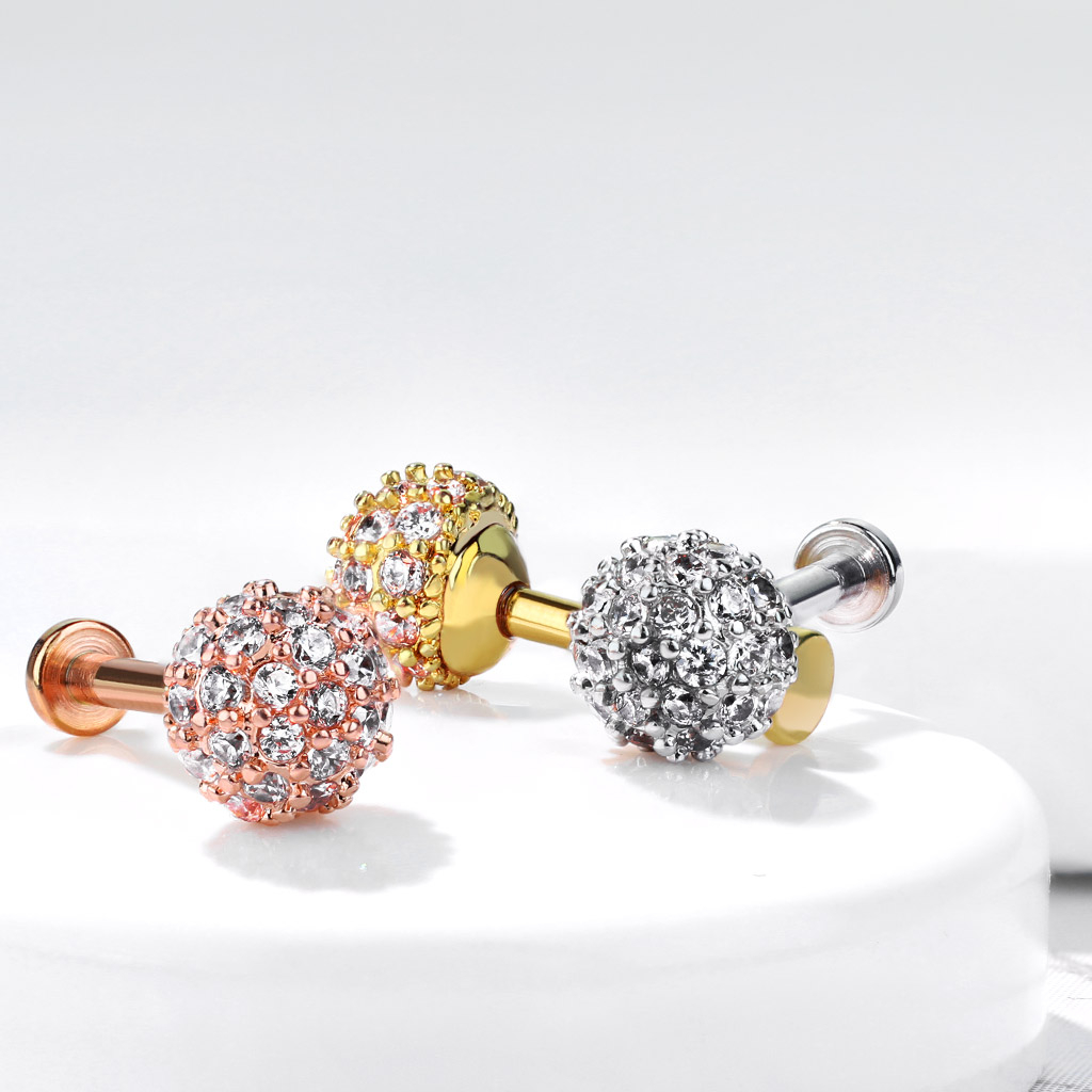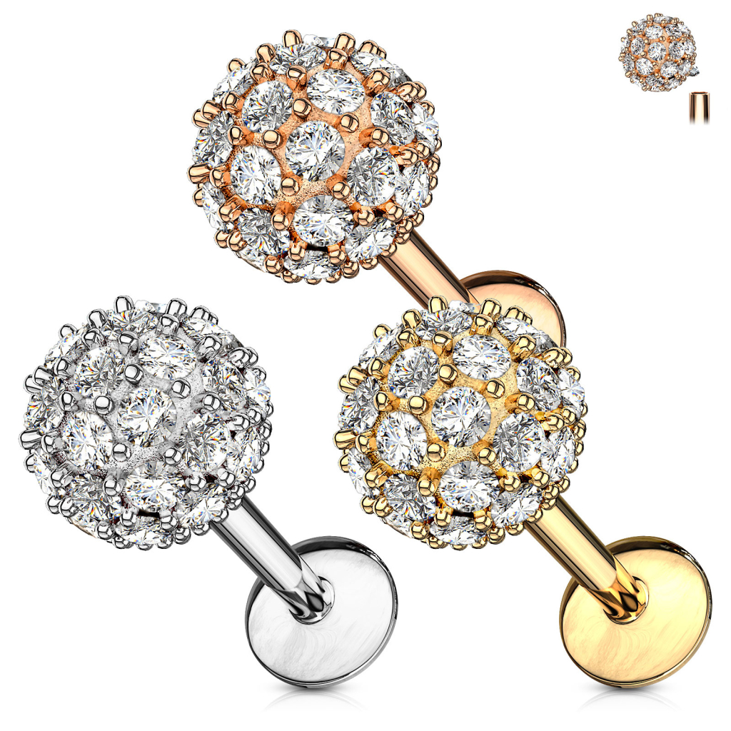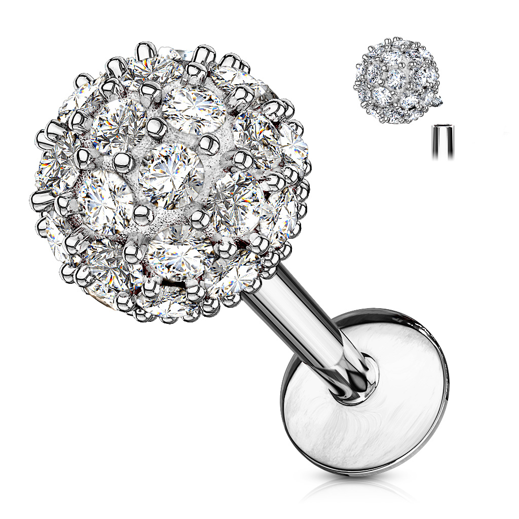 Der Schmuck ist mit einer großen Kugel von ganzen 6 mm im Durchmesser ausgestattet. Auf der Kugel wurden viele kleine klare Steine angebracht. Diese Steine funkeln regelrecht, sobald das Licht auf sie trifft - dies macht dieses Labret zum absoluten Hingucker.