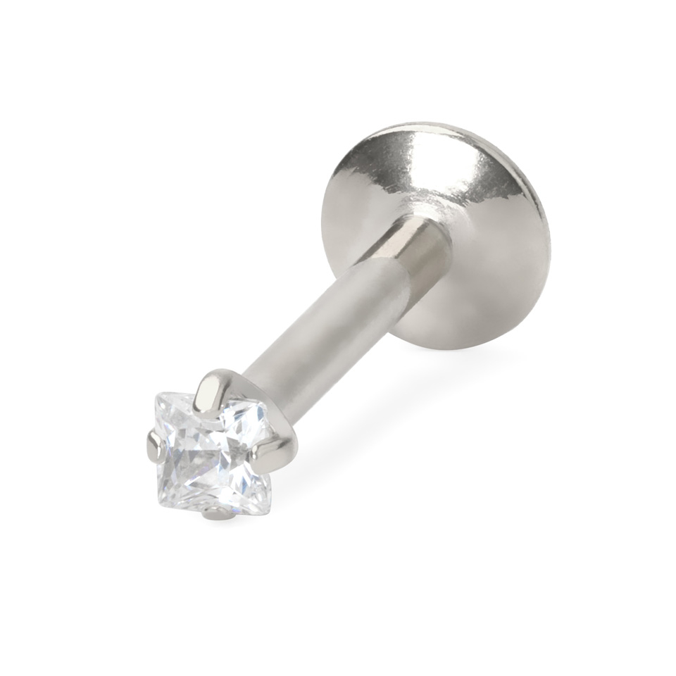 Dieses Labret aus Chirurgenstahl verfügt über einen viereckigen Stein in Zackenfassung und ein Innengewinde.