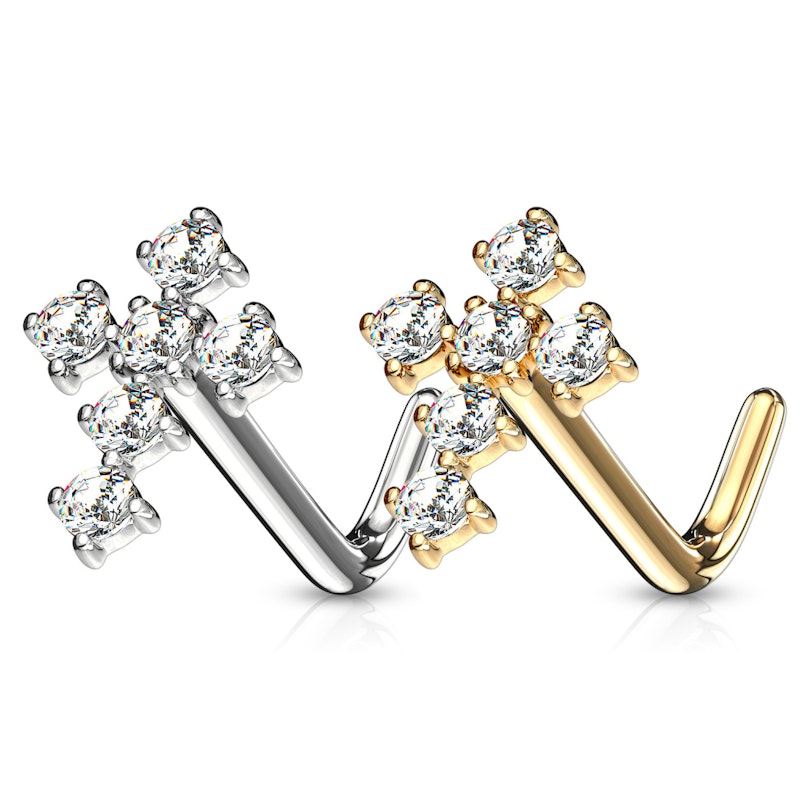 Man muss schon sagen, dass dieses Nasenpiercing spektakulär ist. Von der schönen Farbe des Stabs bis zum funkelnden und auffälligen Kreuz auf der Vorderseite - alles passt einfach perfekt. Dieser Schmuck ist aus 14 Karat Gold gefertigt, dies verleiht dem Schmuck Exklusivität und macht es noch hochwertiger. Du kannst bei dem Schmuck aus der regulären 14 Karat Gold oder 14 Karat Weißgold Variante wählen. Der Nasenstecker ist mit einem kleinen 90° Winkel ausgestattet, dieser sorgt für ein angenehmeres Einsetzen des Schmucks und verhindert, dass der Schmuck herausfällt. Wie du auf dem Produktbild weiter oben erkennen kannst, befindet sich auf der Vorderseite des Schmucks ein Kreuz. Das Kreuz ist 5.8 mm hoch und 4.3 mm breit. Sechs facettengeschliffene Steine wurden auf dem Kreuz angebracht. Die Steine bestehen aus Zirkonia und sind nur in einer klaren Version erhältlich. Unabhängig davon, welche Farbe du für den Schmuck auswählst.