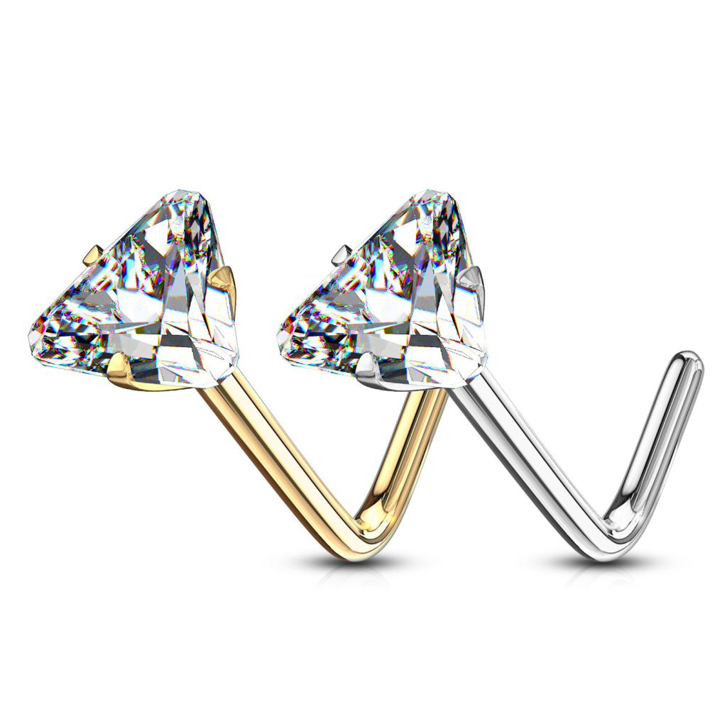 Das Nasenpiercing besteht aus 14-karätigem Gold, wobei du es auch in einer 14kt. Weißgold Version erwerben kannst. Auf der Vorderseite befindet sich ein eleganter dreieckiger Stein. Der Stein kommt immer in einer klaren Version, unabhängig des ausgewählten Materials des Schmucks.