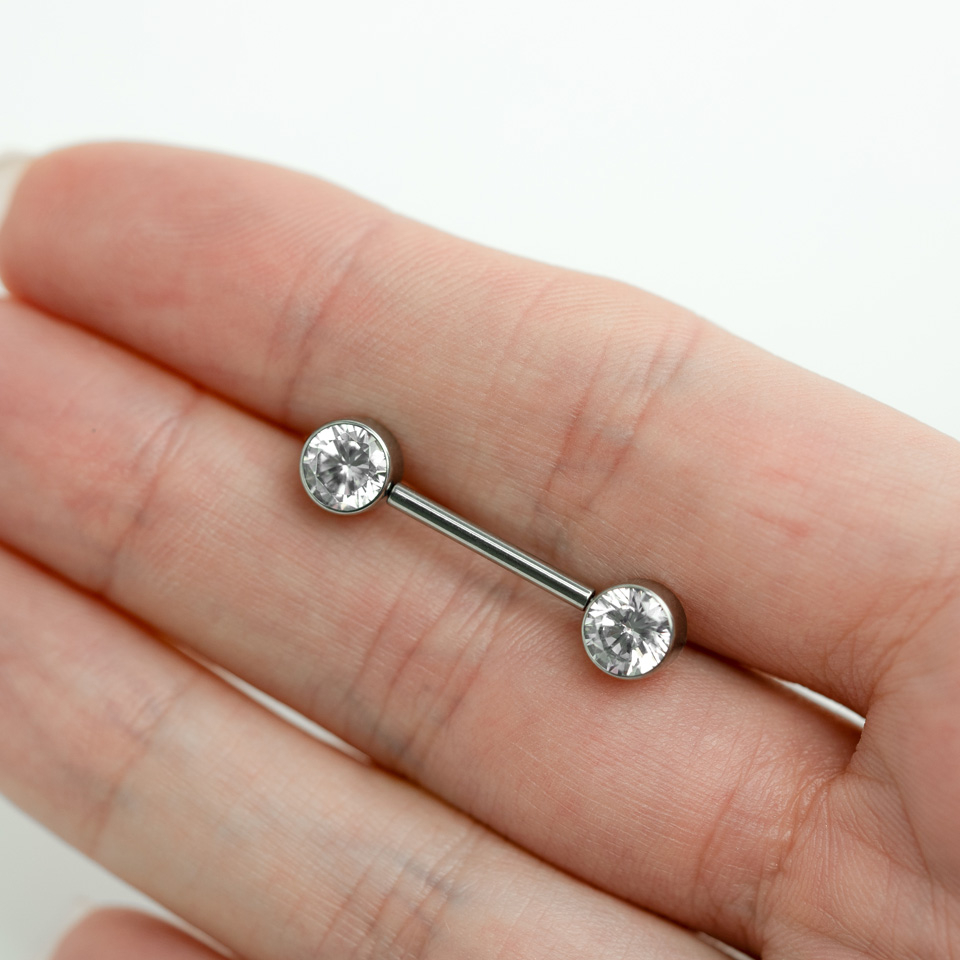 Name: Nippel-Barbell aus Titan mit gewindelosen, eingefassten Steinen