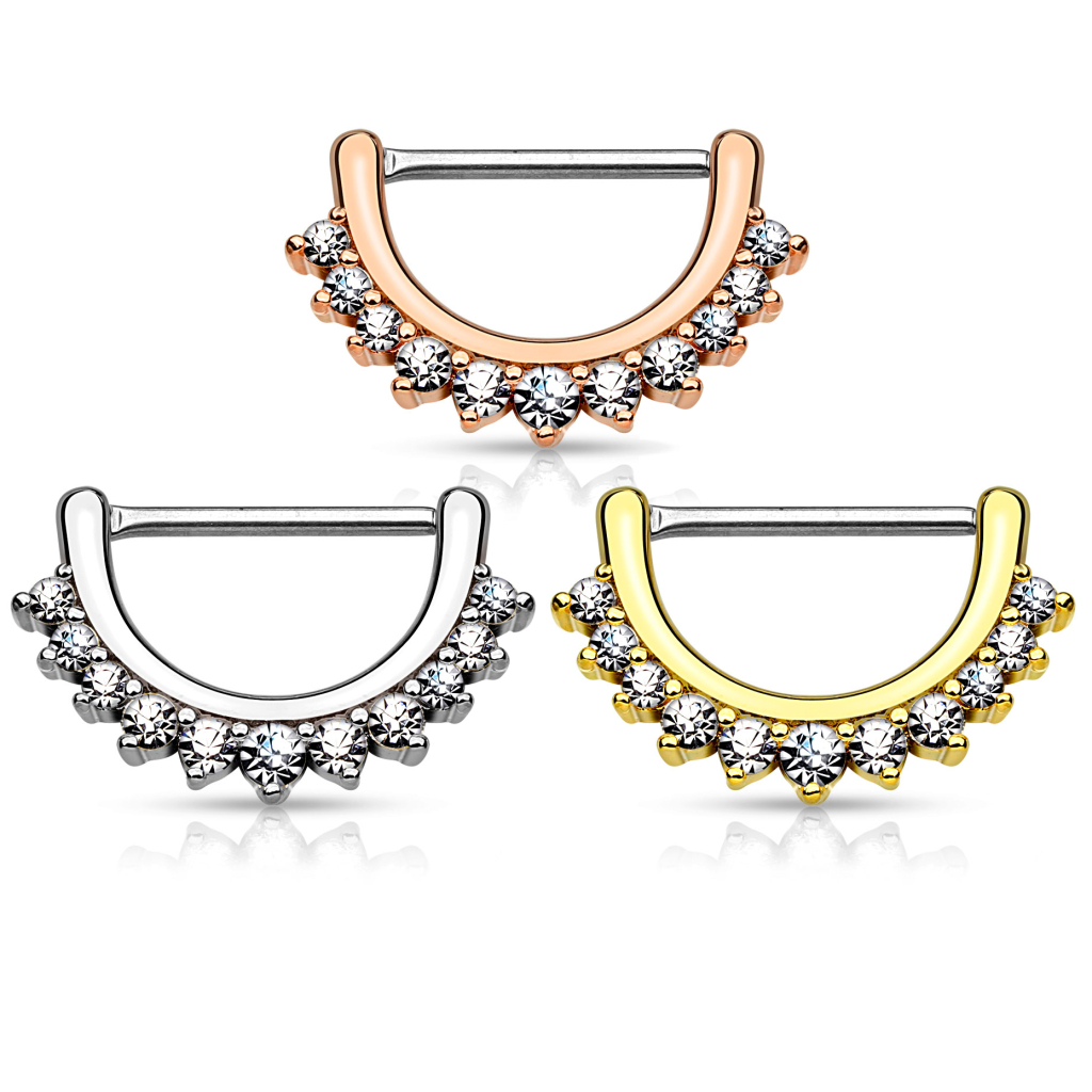 Wie bereits erwähnt, haben wir diesen Nippelclicker in drei Varianten erhältlich, wo nur die Farbe den Unterschied macht. Wähle zwischen der schlichten blanken Version, einer leicht goldenen Variante oder dem modernen Rotgold. Egal für welche Farbe du dich entscheidest, du wirst diesen Schmuck nie langweilig finden, der mit seinen 11 klaren Steinchen einem schönen Halbmond unter der Brustwarze ähnelt.