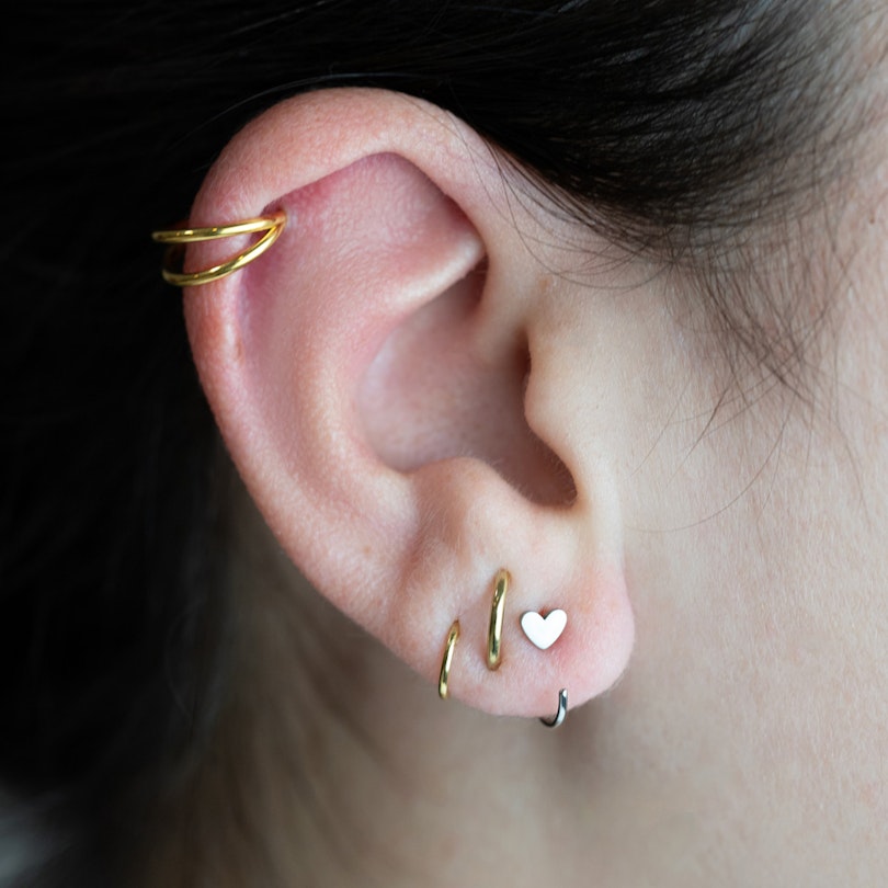 Offener Ring aus Titan mit Herz ist genau das kleine Extra, das dein Ohrring-Stack braucht. Seine offene Form schmiegt sich mühelos ans Ohrläppchen. Schieb einfach das offene Ende durch dein Piercing, dreh es nach vorne und lass es natürlich sitzen. Er sitzt bequem, egal ob am unteren Ohrläppchen, am oberen Ohrläppchen oder gestackt mit anderen Creolen. Die Herz-Details zeigen nach vorn und sorgen für einen cleanen, bewussten Look.