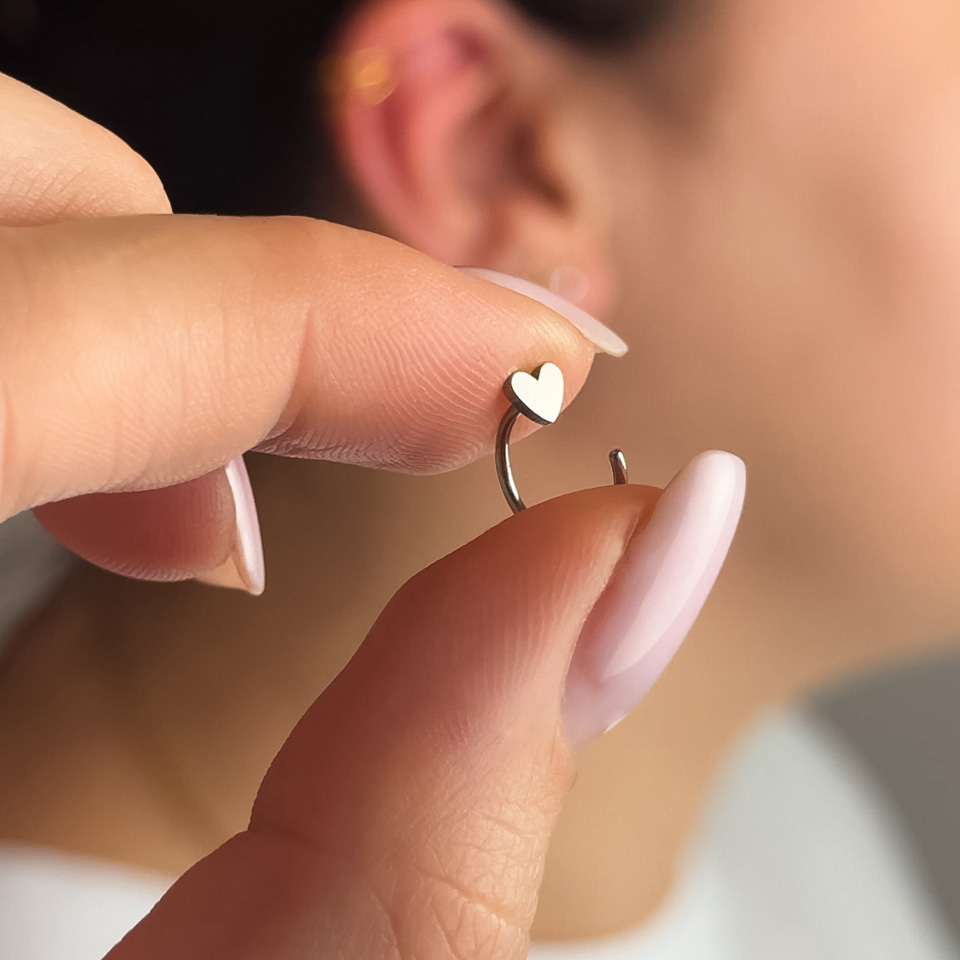 Offener Ring aus Titan mit Herz ist genau das kleine Extra, das dein Ohrring-Stack braucht. Seine offene Form schmiegt sich mühelos ans Ohrläppchen. Schieb einfach das offene Ende durch dein Piercing, dreh es nach vorne und lass es natürlich sitzen. Er sitzt bequem, egal ob am unteren Ohrläppchen, am oberen Ohrläppchen oder gestackt mit anderen Creolen. Die Herz-Details zeigen nach vorn und sorgen für einen cleanen, bewussten Look.