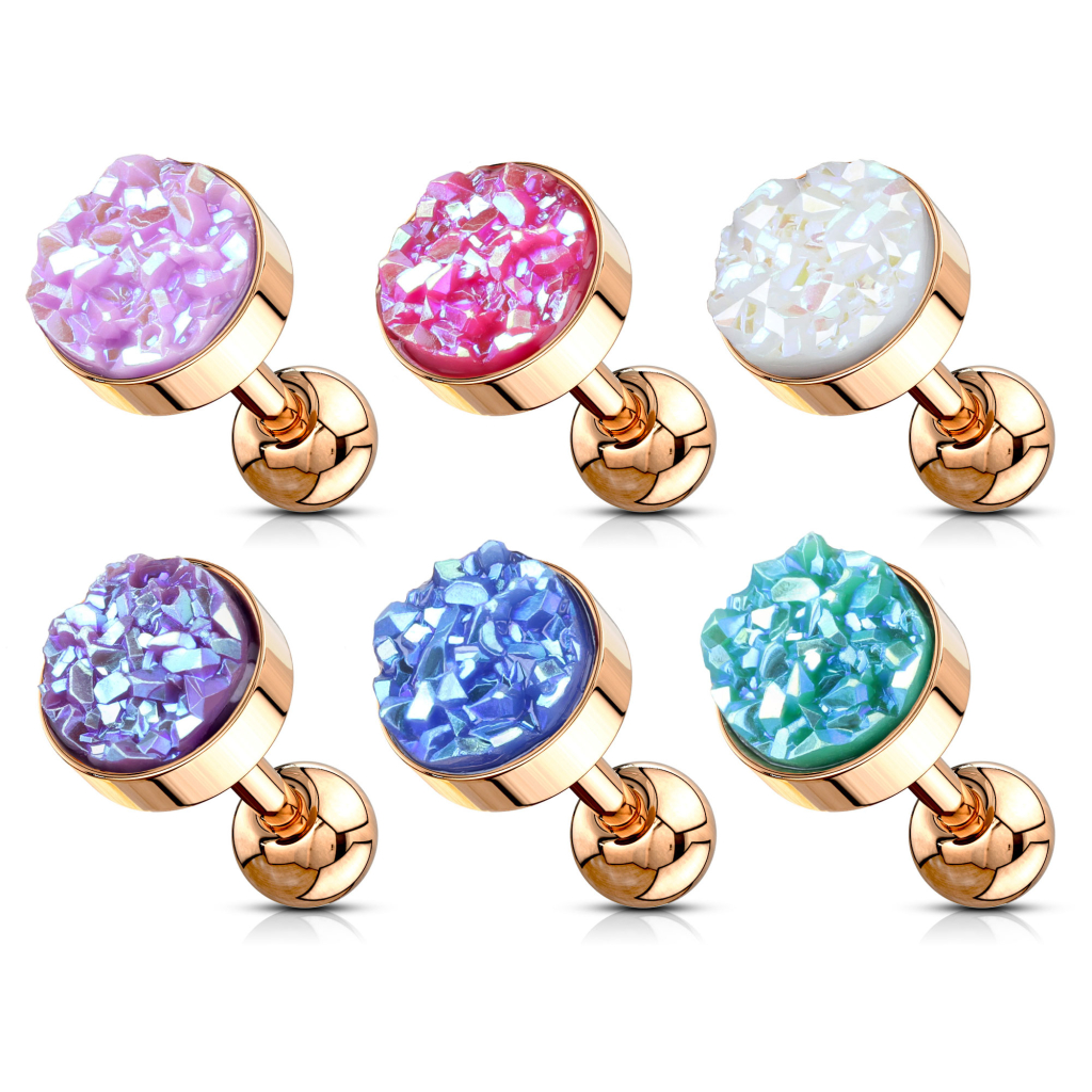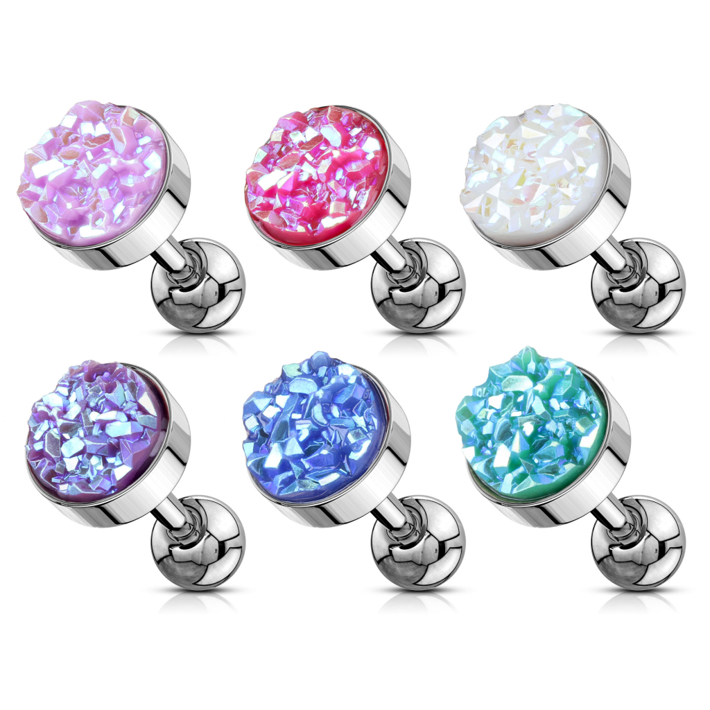 Hier kannst du ein kleines und diskretes Ohrpiercing mit einer großen Persönlichkeit betrachten. Der Schmuck misst 6 mm in der Länge und die Topkugel hat den gleichen Durchmesser. Der Druzy Stein in der Topkugel verleiht dem Schmuck eine grandiose Erscheinung. Ein Druzy Stein an sich ist jedoch kein richtiger Stein, sondern eine Schicht aus kleinen Kristallen. Die Kristallformation ist in fast allen Farben des Regenbogens erhältlich, wie z.B. blau oder weiß. Das Geniale an diesen Kristallen ist, dass sie nicht nur die von dir gewählte Hauptfarbe enthalten, sondern auch viele andere Farben, welche der Hauptfarbe nahe liegen.