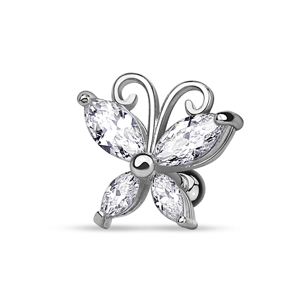 Es ist schwer, das süße Motiv dieses schönen Schmetterlings nicht zu lieben und besonders deswegen, weil er auch noch so wunderschön designt wurde, wie kein anderes Ohrpiercing. Dieser süße Schmetterling besteht nämlich aus vier kleinen Flügeln, die jeweils alle aus einem länglichen Stein geformt wurden. Die beiden oberen Flügel sind etwas größer als die beiden unteren, was einem echten Schmetterling ja gleich kommt.
