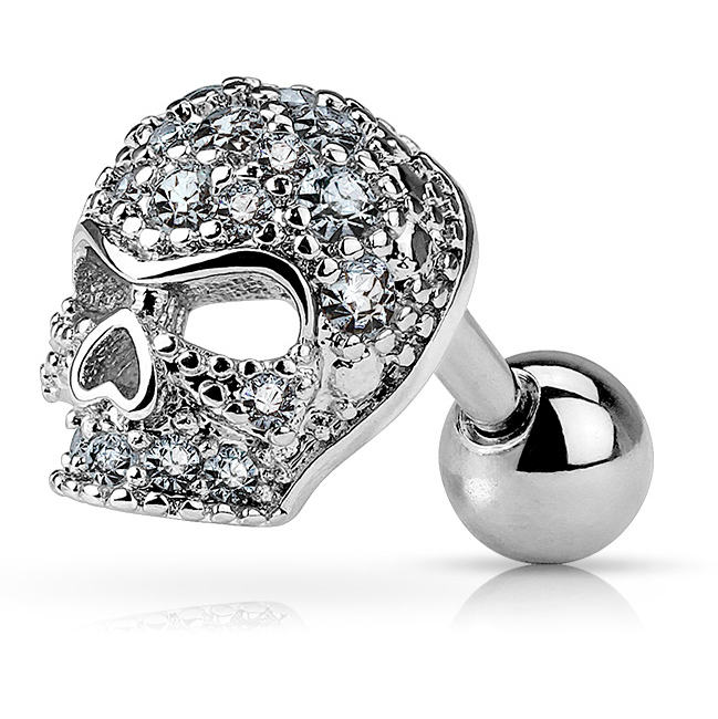 Supercooler Totenkopf, auf einem 6 mm langen Stab montiert und einer 4 mm grossen Schliesskugel auf der Rückseite. Trage den Schmuck, wenn du richtig gepierct wurdest und die entsprechenden Masse und Stabstärke passen. Das könnte z.B. im Tragus, im Helix oder auch nur im Ohrläppchen sein. Egal wo du dieses Schmuckstück einsetzt, wird es auf jeden Fall durch den steinverzierten Totenkopf richtig markant und rockig aussehen.
