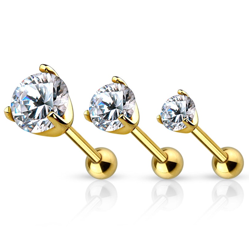 Hier bekommst du wirklich absoluten Luxus in Form von einem Ohrpiercingset aus 14 Karat Gold mit Steinen. Die drei schönen Ohrpiercings haben alle eine Stabstärke von 1,2 mm und passen somit perfekt in alle Ohrlöcher, die mit einer Nadel gestochen wurde. Jedes Ohrpiercing wurde mit meinem funkelnden, klaren Stein ausgestattet. Das Set besteht aus drei verschieden großen Ohrpiercings, dh. du erhältst hier jeweils einen 2 mm, 3 mm und 4 mm großen Stein samt goldenen Stecker.