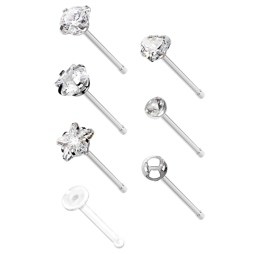Mit diesem Paket aus 7 Nasensteckern liegt es ganz an dir, welchen Schmuck du wann tragen möchtest. Selbstverständlich musst du dich nicht an einen Nasenstecker am Tag halten, warum nicht ein bisschen aufpeppen - den Nasenretainer für die Arbeit und am Abend den Nasenstecker mit Herz- oder Sternform. Alle Nasenstecker bestehen aus Chirurgenstahl, bis auf den Nasenretainer. Die Abmessungen sind für alle Nasenstecker gleich, sie haben eine Stabstärke von 0,8 mm und eine Länge von 6 mm.