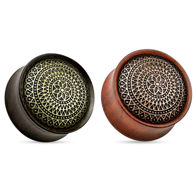 Diesen wunderschönen Plug haben wir in zwei verschiedenen Holzsorten auf Lager. Wähle zwischen dem rötlichen Rosenholz oder dem edlen schwarzen Ebenholz. Die Farbe der Verzierungen stehen in einem schönen Kontrast zu der natürlichen Holzfarbe. Die goldene Farbe des Musters lässt den schwarzen Plug antik und wertvolll erscheinen wogegen die rötliche Farbe des Rosenholzes schön mit dem kupferfarbenden Muster harmoniert und ihm einen warmen Glanz verleiht.