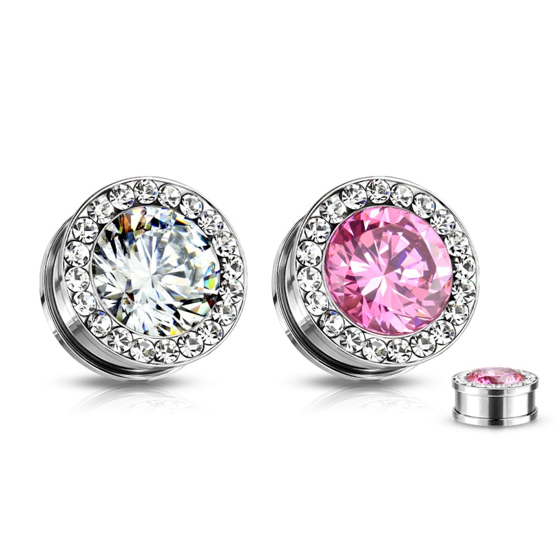 Der Plug wurde aus Chirurgenstahl hergestellt und hat auf der Rückseite ein Schraubgewinde, was es leichter macht den Plug ins Ohr zu bekommen. Die Vorderseite wird von einem großen, farbigen Stein im Zentrum geziert und rund um diesen großen Stein sind viele kleine, klare Stein verteilt. Je größer der Durchmesser des Plugs, desto mehr mehr kleine Steine sind zu sehen. Alle Steine sind wie Diamanten geschliffen und reflektieren das einfallende Licht.