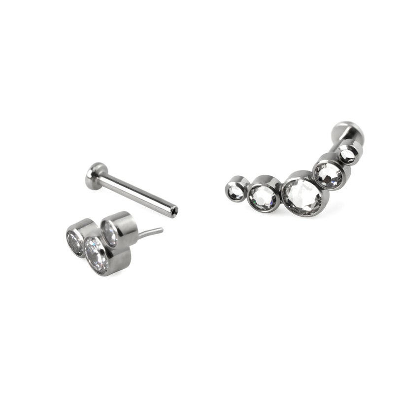 Dieses Labret ist ein sogenanntes Push-In-Labret, was bedeutet, dass der Schmuck kein Gewinde hat. Anstatt eines Gewindes befindet sich eine kleine Nadel, die leicht gebogen ist: So wird die schöne Dekoration an dem Hauptteil befestigt. Dieses Design macht den Körperschmuck sehr einfach zu bedienen. Dieser Schmuck ist auch in zwei verschiedenen Designs erhältlich. Du kannst zwischen Dekorationen mit 5 Steinen oder 3 Steinen wählen. Selbstverständlich bieten wir dir auch verschiedene Farbkombinationen an. Die Steine auf den Dekorationen variieren in der Größe. Der mittlere Stein auf dem Produkt mit 5 Steinen hat eine Größe von 4 mm, der zweitgrößte Stein 3 mm, und der kleinste 2 mm.