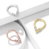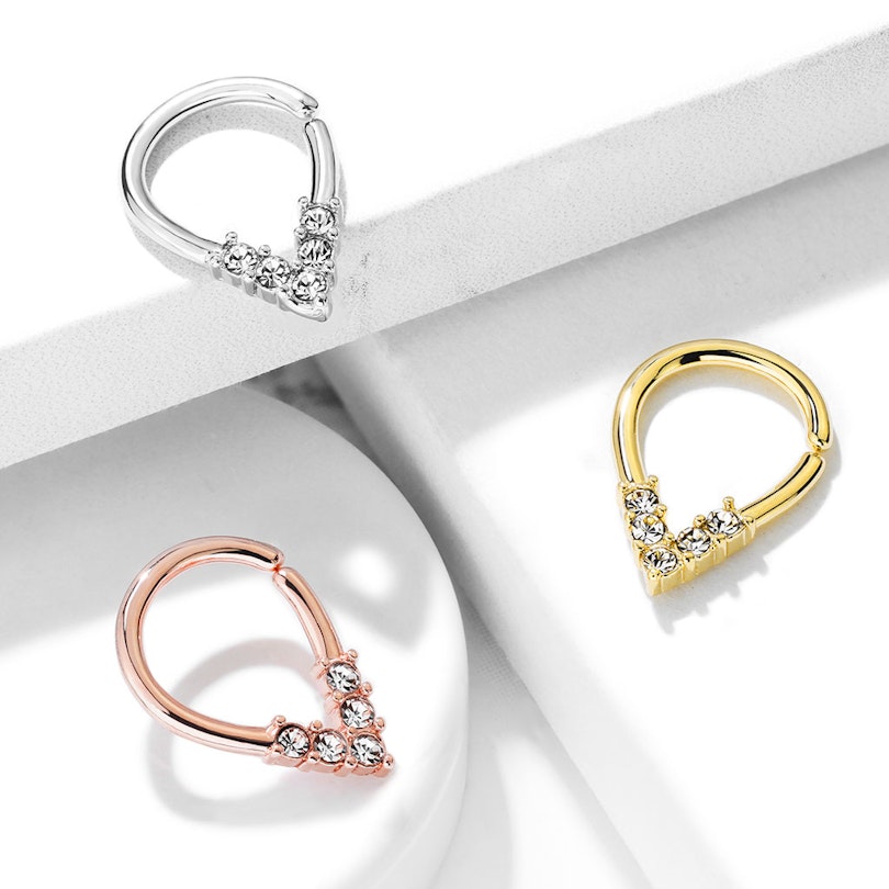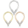 Messing ist jedoch keine besonders hübsche Farbe für Piercingschmuck, daher wurde dieser Schmuck auch beschichtet. Die Gold Version wurde beispielsweise mit 14 Karat Gold beschichtet. Am unteren Rand des Schmucks sitzen fünf kleine klare Steine, welche dem Schmuck seine Eleganz verleihen.