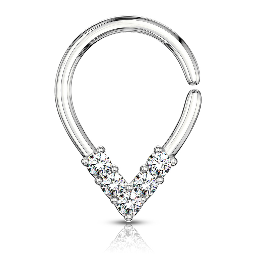Messing ist jedoch keine besonders hübsche Farbe für Piercingschmuck, daher wurde dieser Schmuck auch beschichtet. Die Gold Version wurde beispielsweise mit 14 Karat Gold beschichtet. Am unteren Rand des Schmucks sitzen fünf kleine klare Steine, welche dem Schmuck seine Eleganz verleihen.