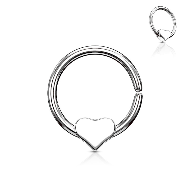 Dieser Ring besteht eigentlich nur aus zwei Stücken Chirurgenstahl. Zum einem der Ring selbst mit einer kleinen Öffnung und dem herzförmigen Anhänger. Durch das Herz wurde ein Loch gebohrt, das ein wenig größer als die eigentliche Stabstärke des Ringes ist. Deswegen kann sich das Herz auch frei bewegen, wenn der Schmuck an seinem Platz sitzt. Die Schwerkraft wird natürlich dafür sorgen, dass das Herz immer unten sitzen wird.