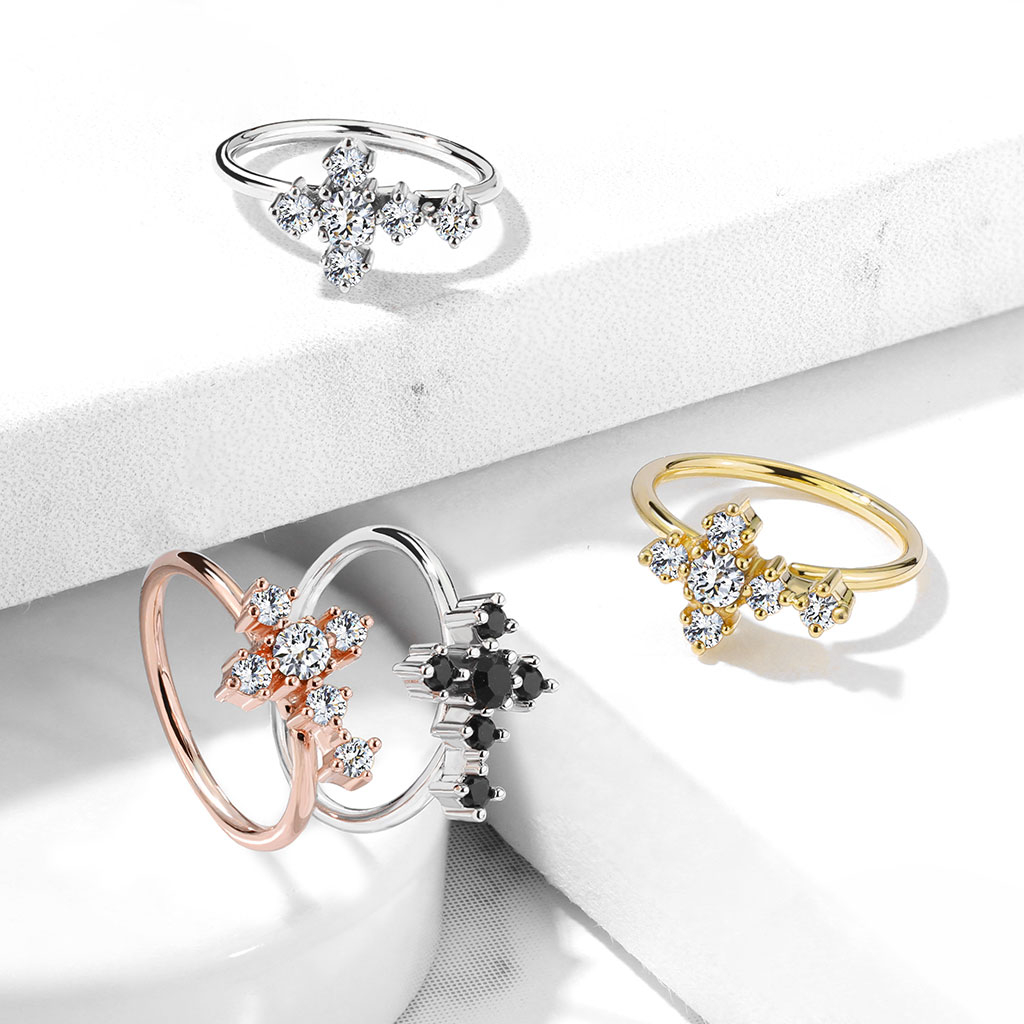 Der Schmuck besteht aus Messing und misst 0,8 mm in der Stabstärke und 8 mm im Durchmesser. Die blanke Version wurde mit Platin und die beiden Gold Versionen mit 14 Karat Gold beschichtet. Wie du bereits bemerkt hast, befindet sich auf der Vorderseite des Schmucks ein schönes Kreuz. Dieses Kreuz wurde mit sechs kleinen Steinen besetzt, dessen Farbe du auswählen kannst. Du kannst den Ring unter anderem mit klaren oder schwarzen Steinen erwerben.